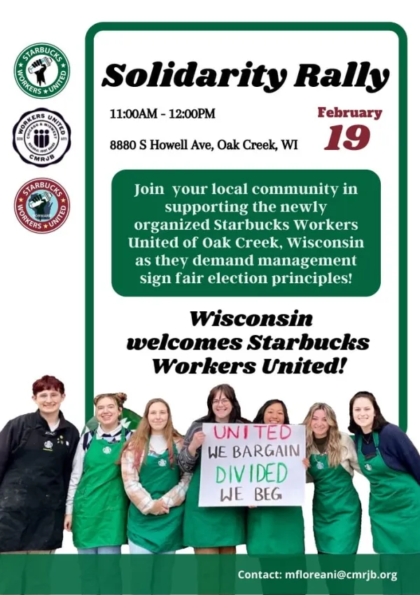 Blog Starbucks Oak Creek Solidarity Rally Milwaukee Area Labor Council, AFL-CIO 17 Feb, 2022 Social share icons